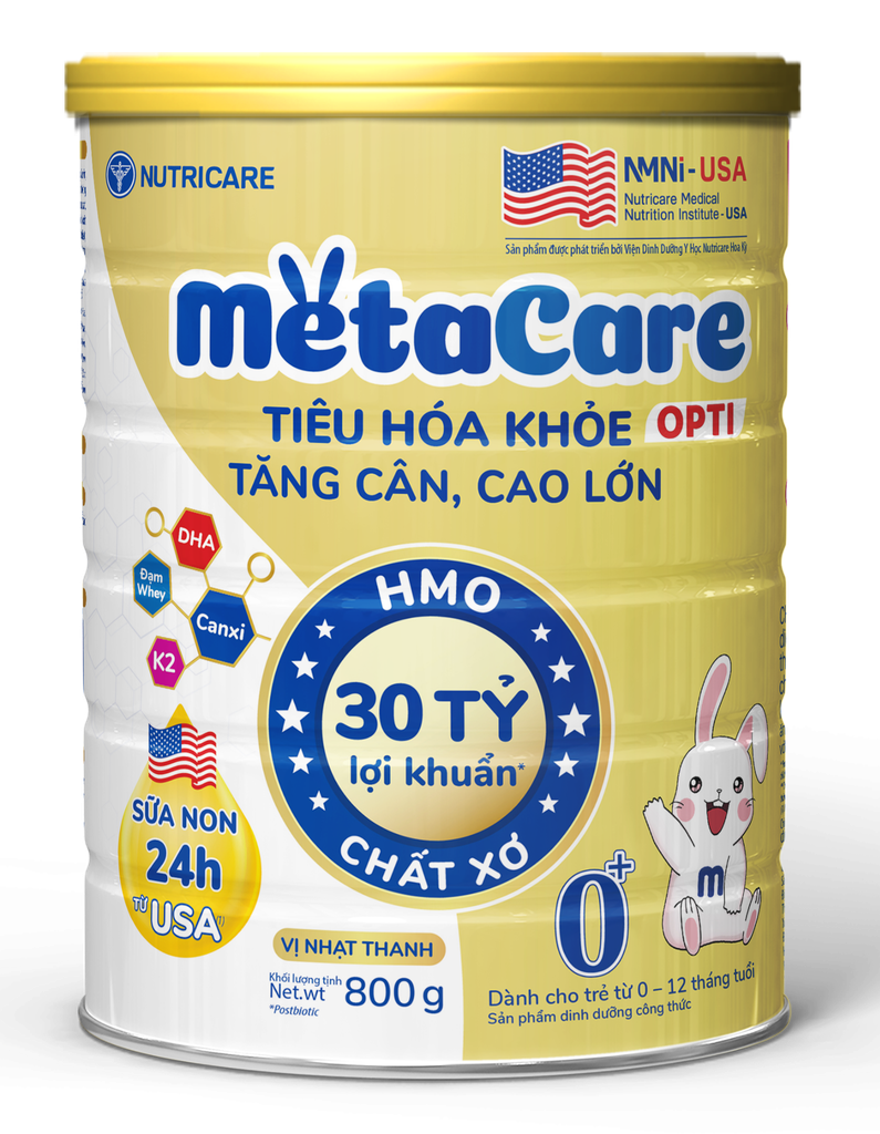 Sữa bột Metacare 0+ (dành cho trẻ 0-12 tháng) là sản phẩm của Nutricare, tập trung vào phát triển toàn diện: tiêu hóa khỏe mạnh nhờ lợi khuẩn Postbiotic, HMO và chất xơ (FOS/Inulin); tăng đề kháng với sữa non Colos 24h, Kẽm, Antioxidant; phát triển chiều cao vượt trội với Canxi từ tảo đỏ, D3, K2; và phát triển trí não nhờ DHA, Choline, Axit Folic. Sữa chứa đạm Whey dễ hấp thu, 52-60 dưỡng chất, đáp ứng nhu cầu dinh dưỡng WHO, giúp bé ăn ngon, tăng cân, thông minh và cứng cáp hơn.