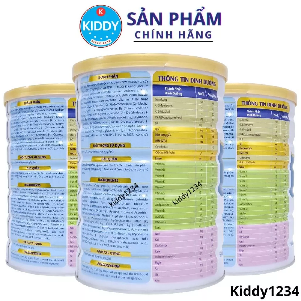 Sữa bột (nguyên kem/gầy), chất béo thực vật/MCT, DHA, Tổ yến, Sữa non (Colostrum), chất xơ hòa tan (FOS/GOS) cùng hỗn hợp vitamin và khoáng chất như Canxi, Vitamin D3, Vitamin K1, Kẽm, Sắt và các vi chất dinh dưỡng khác.