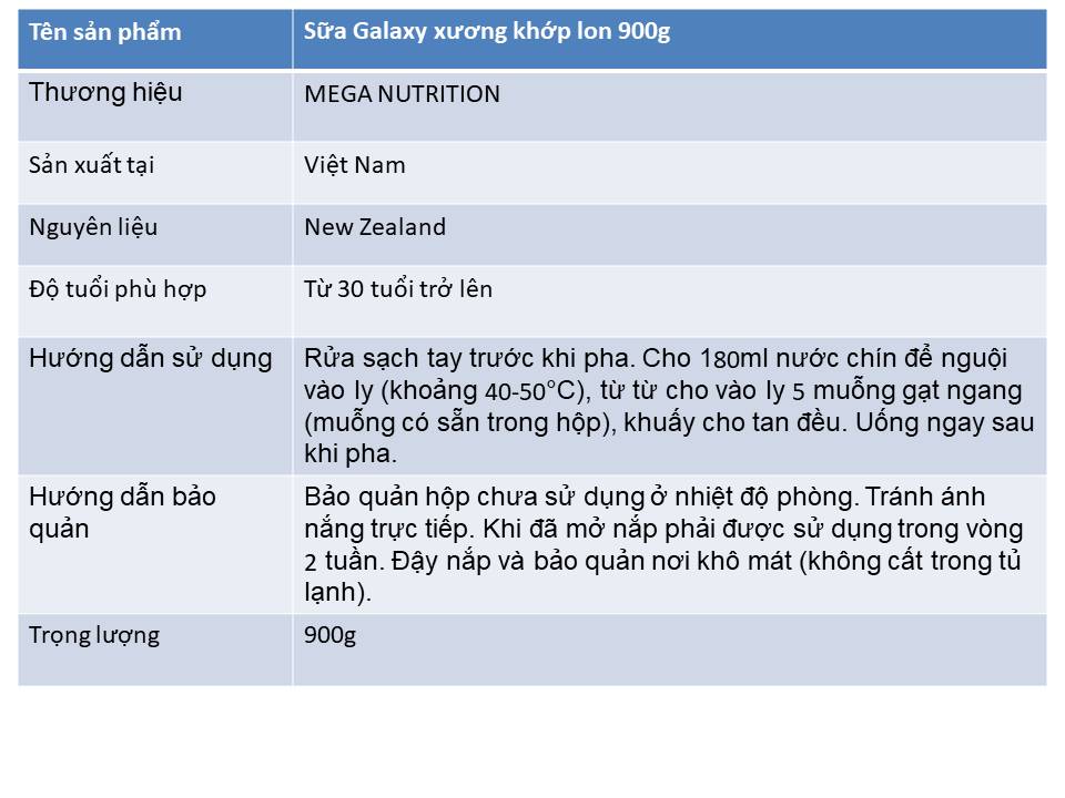 Sữa Galaxy Xương khớp có chứa Magie, Canxi, Phosphat, Vitamin (D3, A, B1, B6) giúp phòng chống loãng xương, làm chậm quá trình lão hóa xương.